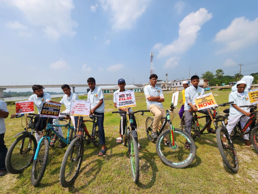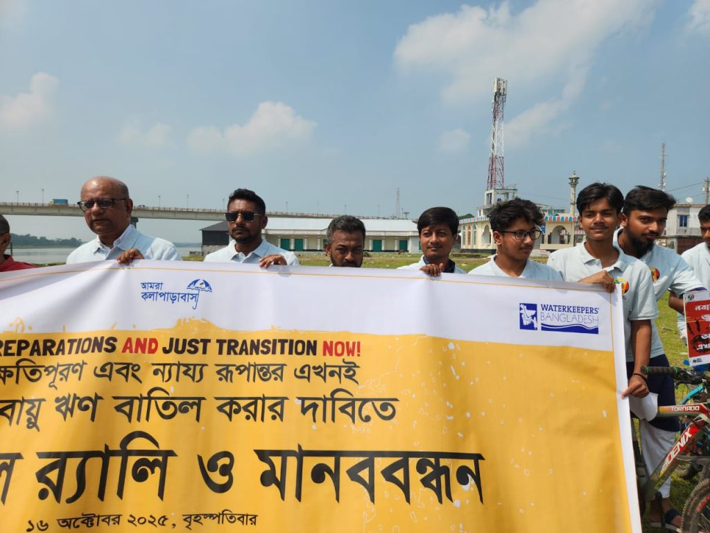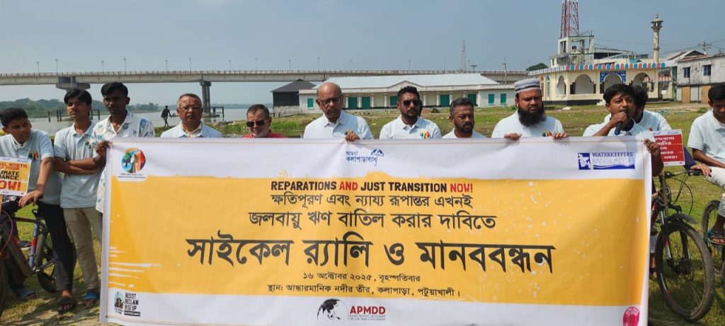 ক্ষতিপূরন দাও এবং ন্যায্য রূপান্তর এখনই, স্লোগানের মধ্য দিয়ে জলবায়ু ঋণ বাতিল করার দাবিতে কলাপাড়ায় মানববন্ধন ও সাইকেল র্যালী অনুষ্ঠিত হয়েছে। আজ বৃহস্পতিবার বেলা ১১ টায় আন্ধার মানিক নদী তীরে মানববন্ধন করা হয়। এখানে বক্তব্য রাখেন দেশ বরেণ্য কলাম লেখক মোহাম্মদ গোলাম নবী, কলাপাড়া প্রেসক্লাবের সাবেক সভাপতি হুমায়ুন কবির, পরিবেশ সংগঠক মেজবাহউদ্দিন মাননু, সাংবাদিক এসএম মোশারফ হোসেন মিন্টু, তানজিল জামান জয়, উন্নয়ন সংগঠক সাইফুল্লাহ মাহমুদ, আমরা কলাপাড়াবাসী সভাপতি নাজমুস সাকিব, পরিবেশ সংগঠক নজরুল ইসলাম প্রমুখ। পরে পরিবেশ কর্মী ও শিক্ষার্থীদের অংশ গ্রহণে সাইকেল র্যালী শহর প্রদক্ষিণ করা হয়। সাইকেল র্যালীতে বিভিন্ন ধরনের প্ল্যাকার্ড ফেস্টুন প্রদর্শন করা হয়। পরিবেশে বাদী সংগঠন ধরিত্রী রক্ষায় আমরা ধরা, ওয়াটার কিপার্স বাংলাদেশ ও আমরা কলাপাড়াবাসী স্বেচ্ছাসেবী সংগঠন যৌথ উদ্যোগে জনসচেতনতামূলক এ কর্মসূচি অনুষ্ঠিত হয়। এ কর্মসূচিতে পরিবেশ কর্মী, শিক্ষক, উন্নয়ন সংগঠক, শিক্ষার্থীসহ বিভিন্ন শ্রেণি-পেশার মানুষ অংশ গ্রহণ করেন। বক্তারা জলবায়ু ঋণ বাতিল করে ন্যায্য ক্ষতিপূরণ দেওয়ার পাশাপাশি এখনই ন্যায্য রূপান্তরের দাবি জানান। পাশাপাশি কলাপাড়ায় কয়লা দূষণ বন্ধের দাবি জানান।