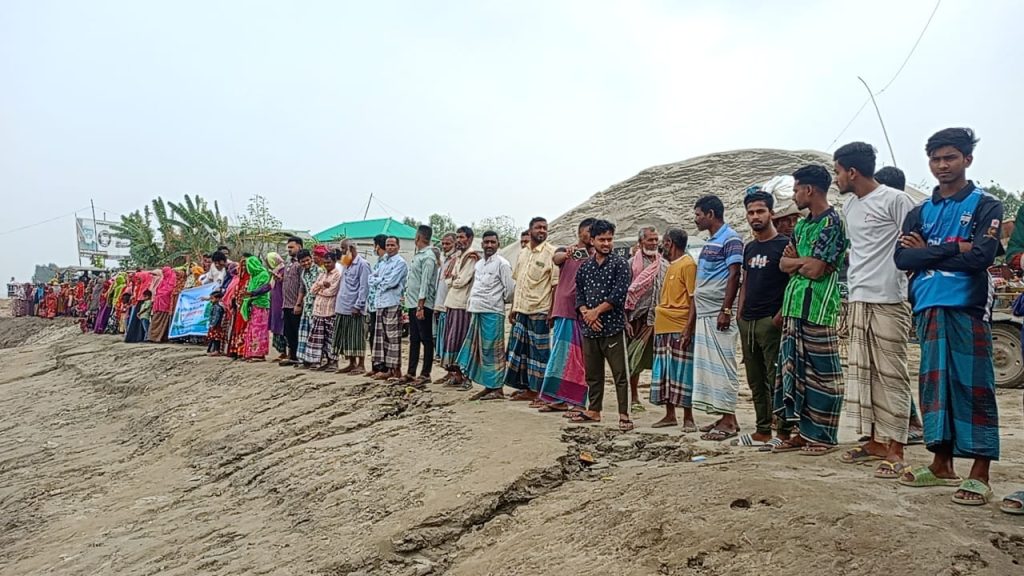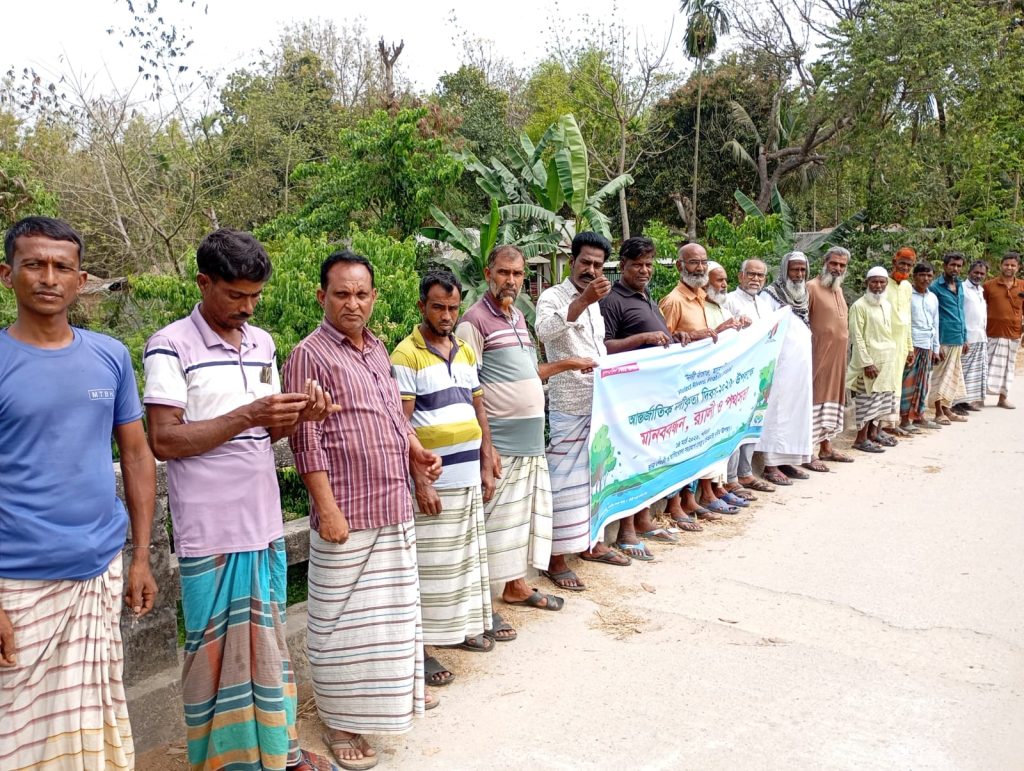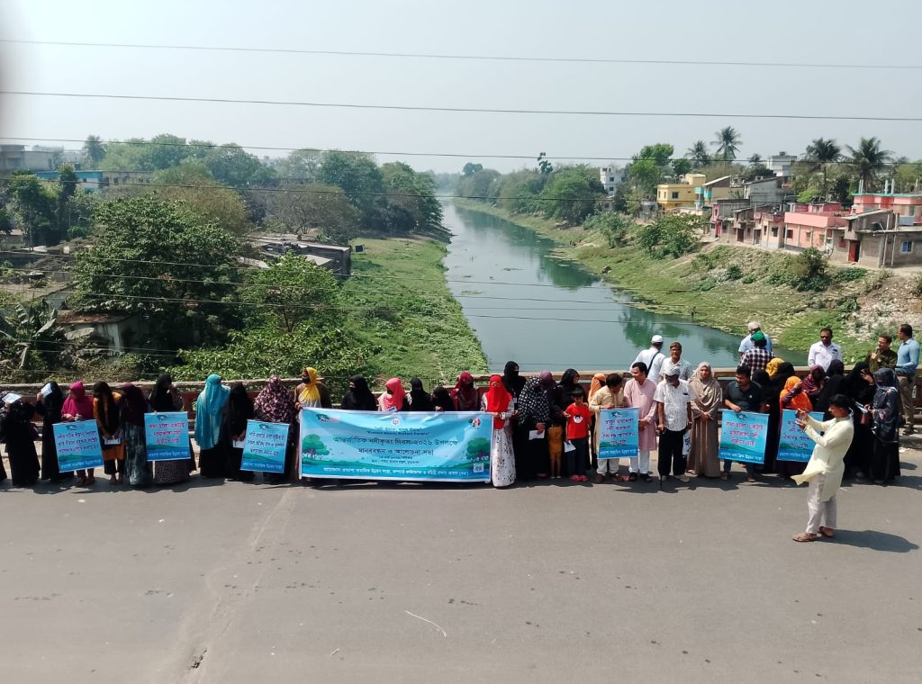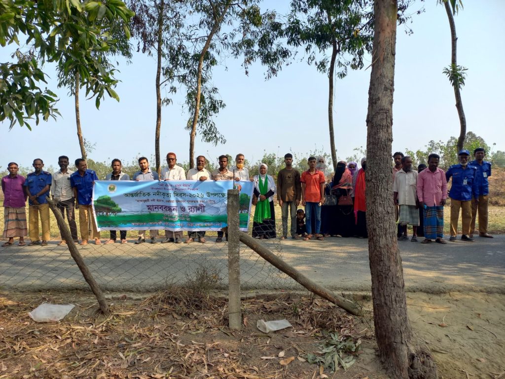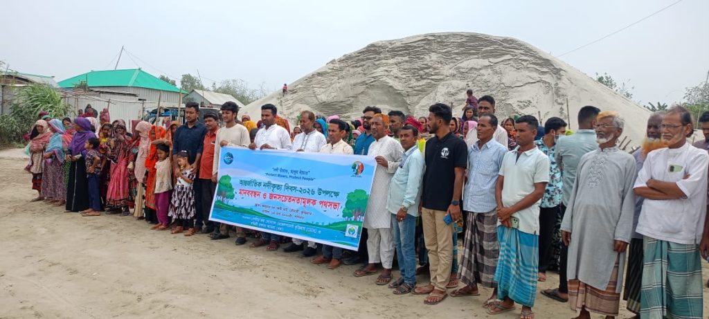 কুড়িগ্রাম: রৌমারীতে ধরা ও সেন্টার ফর সোশ্যাল ডেভেলপমেন্ট কুড়িগ্রাম (সিএসডিকে) আয়োজনে ১৩ মার্চ ২০২৬ মানববন্ধন ও পথসভা অনুষ্ঠিত হয়। ব্রহ্মপুত্র নদীর ফলুয়ারচর ফেরিঘাটে স্থানীয় নারী-পুরুষ, তরুণ-তরুণী ও বিভিন্ন পেশার মানুষ অংশ নেন। “নদী বাঁচাও, মানুষ বাঁচাও” স্লোগানে তারা দখল ও দূষণ বন্ধ এবং নদীর স্বাভাবিক প্রবাহ ফিরিয়ে আনার দাবি জানান। বক্তারা বলেন, নদী জীবন, কৃষি ও জীববৈচিত্র্যের সঙ্গে গভীরভাবে যুক্ত। নদী রক্ষা না করলে পরিবেশের ভারসাম্য নষ্ট হবে।