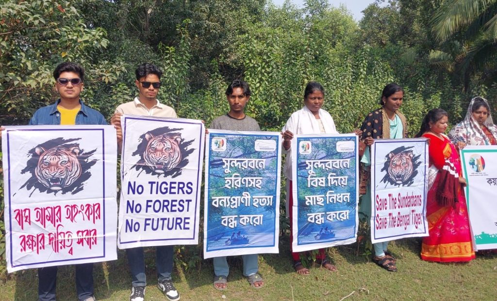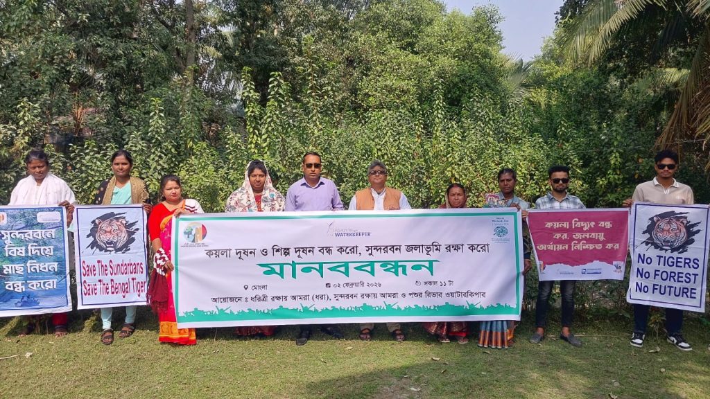 ধরিত্রী রক্ষায় আমরা (ধরা), সুন্দরবন রক্ষায় আমরা ও পশুর রিভার ওয়াটারকিপার এর আয়োজনে ০২ ফেব্রুয়ারি, সোমবার, সকাল ১১টায় কাপালিরমেঠ গ্রাম, মোংলা বিশ্ব জলাভূমি দিবস উপলক্ষ্যে কয়লা দূষণ এবং শিল্প দূষণ বন্ধ করে বিশ্ব ঐতিহ্য সুন্দরবন জলাভূমি রক্ষায় মানববন্ধন অনুষ্ঠিত হয়। রামসার কনভেনশন অনুযায়ী ১৯৯২ সালে আন্তর্জাতিক গুরুত্বপূর্ণ জলাভূমি হিসেবে ঘোষিত বিশ্ব ঐতিহ্য সুন্দরবন আজ কয়লা দূষণ, শিল্প দূষণ, বিষ প্রয়োগে মাছ নিধন, প্লাস্টিক-পলিথিন দূষণ ও বন্যপ্রাণী অপরাধের কারণে মারাত্মক হুমকির মুখে, এমন বক্তব্য উঠে আসে মানববন্ধনে। বক্তারা বলেন, পশুর নদীসহ সুন্দরবনের নদ-নদীতে বিষাক্ত পারদের উপস্থিতি প্রাণপ্রকৃতি ও মানুষের জীবন-জীবিকাকে বিপর্যস্ত করছে এবং উন্মুক্তভাবে কয়লা পরিবহন ও অপরিকল্পিত শিল্পায়ন বন্ধ না করলে সুন্দরবন জলাভূমি রক্ষা করা সম্ভব নয়। মানববন্ধনে সভাপতিত্ব করেন সুন্দরবন রক্ষায় আমরা’র সমন্বয়কারী ও পশুর রিভার ওয়াটারকিপার পরিবেশযোদ্ধা মোঃ নূর আলম শেখ; উপস্থিত ছিলেন জেলে সমিতির নেতা আব্দুর রশিদ হাওলাদার, ধরা’র নেত্রী কমলা সরকার, ওয়াটারকিপার্স বাংলাদেশ’র হাছিব সরদার, পশুর রিভার ওয়াটারকিপার ভলান্টিয়ার মেহেদী হাসান, ইয়ুথ লিডার আরাফাত আমিন দূর্জয় ও শেখ সাব্বির হাসান দীপ্তসহ অন্যান্যরা। বক্তারা সুন্দরবন সংলগ্ন এলাকায় আইনশৃঙ্খলা বাহিনীর গোয়েন্দা নজরদারি জোরদার, বিষ প্রয়োগে মাছ নিধন ও বন্যপ্রাণী অপরাধ বন্ধ এবং সুন্দরবন বিনাশী রামপাল কয়লা বিদ্যুৎ কেন্দ্রসহ সব ক্ষতিকর শিল্প প্রকল্প বন্ধের জোর দাবি জানান।