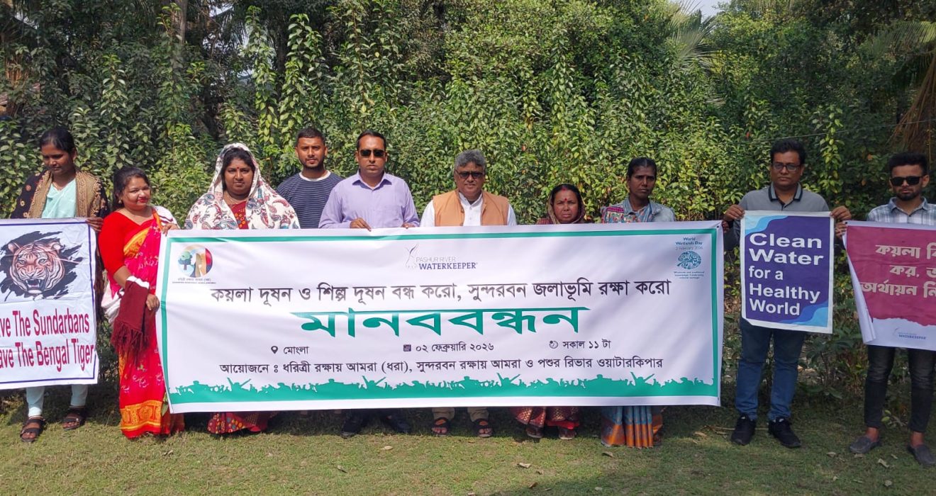 ধরিত্রী রক্ষায় আমরা (ধরা), সুন্দরবন রক্ষায় আমরা ও পশুর রিভার ওয়াটারকিপার এর আয়োজনে ০২ ফেব্রুয়ারি, সোমবার, সকাল ১১টায় কাপালিরমেঠ গ্রাম, মোংলা বিশ্ব জলাভূমি দিবস উপলক্ষ্যে কয়লা দূষণ এবং শিল্প দূষণ বন্ধ করে বিশ্ব ঐতিহ্য সুন্দরবন জলাভূমি রক্ষায় মানববন্ধন অনুষ্ঠিত হয়। রামসার কনভেনশন অনুযায়ী ১৯৯২ সালে আন্তর্জাতিক গুরুত্বপূর্ণ জলাভূমি হিসেবে ঘোষিত বিশ্ব ঐতিহ্য সুন্দরবন আজ কয়লা দূষণ, শিল্প দূষণ, বিষ প্রয়োগে মাছ নিধন, প্লাস্টিক-পলিথিন দূষণ ও বন্যপ্রাণী অপরাধের কারণে মারাত্মক হুমকির মুখে, এমন বক্তব্য উঠে আসে মানববন্ধনে। বক্তারা বলেন, পশুর নদীসহ সুন্দরবনের নদ-নদীতে বিষাক্ত পারদের উপস্থিতি প্রাণপ্রকৃতি ও মানুষের জীবন-জীবিকাকে বিপর্যস্ত করছে এবং উন্মুক্তভাবে কয়লা পরিবহন ও অপরিকল্পিত শিল্পায়ন বন্ধ না করলে সুন্দরবন জলাভূমি রক্ষা করা সম্ভব নয়। মানববন্ধনে সভাপতিত্ব করেন সুন্দরবন রক্ষায় আমরা’র সমন্বয়কারী ও পশুর রিভার ওয়াটারকিপার পরিবেশযোদ্ধা মোঃ নূর আলম শেখ; উপস্থিত ছিলেন জেলে সমিতির নেতা আব্দুর রশিদ হাওলাদার, ধরা’র নেত্রী কমলা সরকার, ওয়াটারকিপার্স বাংলাদেশ’র হাছিব সরদার, পশুর রিভার ওয়াটারকিপার ভলান্টিয়ার মেহেদী হাসান, ইয়ুথ লিডার আরাফাত আমিন দূর্জয় ও শেখ সাব্বির হাসান দীপ্তসহ অন্যান্যরা। বক্তারা সুন্দরবন সংলগ্ন এলাকায় আইনশৃঙ্খলা বাহিনীর গোয়েন্দা নজরদারি জোরদার, বিষ প্রয়োগে মাছ নিধন ও বন্যপ্রাণী অপরাধ বন্ধ এবং সুন্দরবন বিনাশী রামপাল কয়লা বিদ্যুৎ কেন্দ্রসহ সব ক্ষতিকর শিল্প প্রকল্প বন্ধের জোর দাবি জানান।
