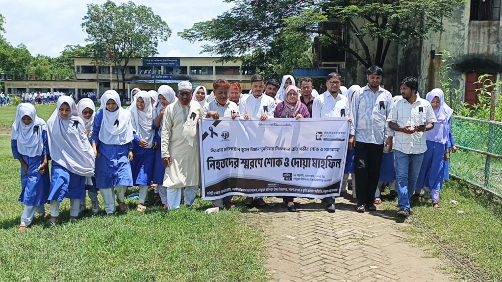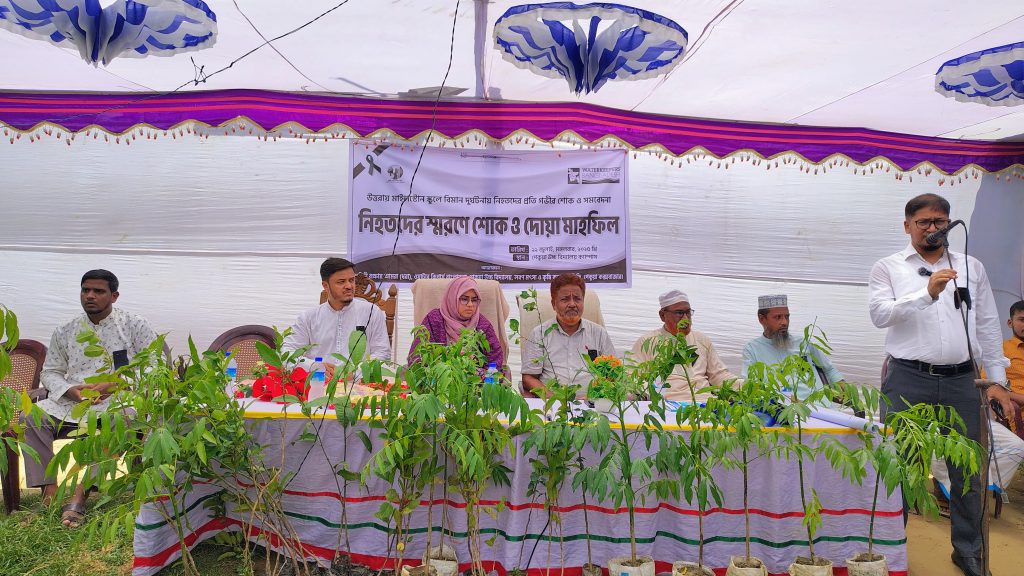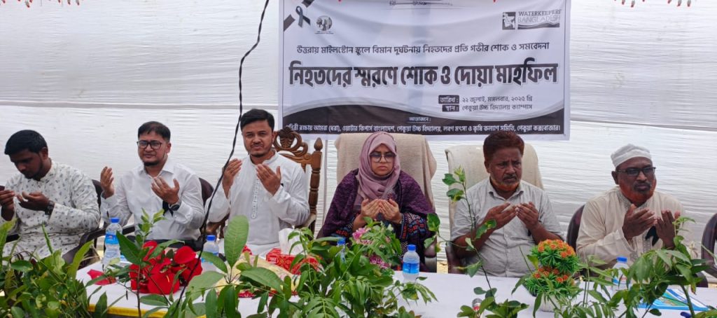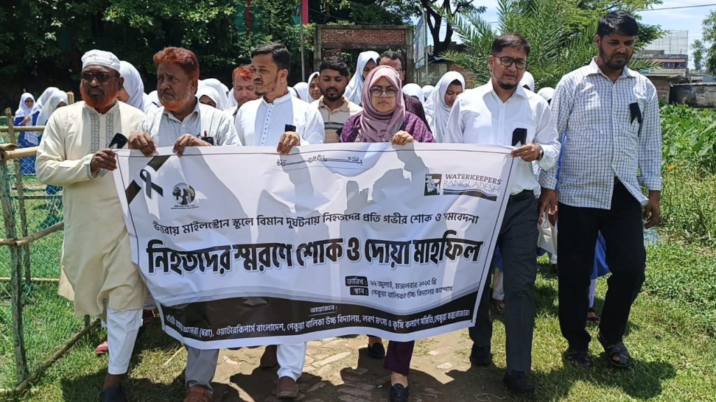 ২২ জুলাই, ২০২৫, মঙ্গলবার দুপুর ১২ টায় ঢাকার উত্তরায় মাইলস্টোন স্কুলে বিমান দুর্ঘটনায় নিহতদের স্মরণে কক্সবাজারের পেকুয়ায় পরিবেশ ও জলবায়ু বিষয়ক নাগরিক সংগঠন ধরিত্রী রক্ষায় আমরা (ধরা)’ র আয়োজনে শোক র্যালি ও দোয়া মাহফিল অনুষ্ঠিত হয়েছে। পেকুয়া বালিকা উচ্চ বিদ্যালয় ক্যাম্পাসে এ কর্মসূচির আয়োজন করা হয়। পেকুয়া বালিকা উচ্চ বিদ্যালয়ের প্রধান শিক্ষক ও লবণ, মৎস্য ও কৃষি কল্যাণ সমিতির আহবায়ক মাস্টার আবুল হাসেমের সভাপতিত্বে অনুষ্ঠিত উদ্বোধন অনুষ্ঠানে প্রধান অতিথি হিসেবে উপস্থিত ছিলেন পেকুয়া উপজেলা সহকারী কমিশনার (ভূমি) ও এক্সিকিউটিভ ম্যাজিস্ট্রেট নুর পেয়ারা বেগম। এতে বিশেষ অতিথি হিসেবে বক্তব্য রাখেন পেকুয়া প্রেস ক্লাবের প্রতিষ্ঠাতা ও সভাপতি বিশিষ্ট সাংবাদিক শিক্ষানুরাগী মো. ছফওয়ানুল করিম, পেকুয়া বালিকা উচ্চ বিদ্যালয়ের পরিচালনা কমিটির সভাপতি মো. মিজানুল করিম ,পেকুয়া উচ্চ বিদ্যালয় পরিচালনা কমিটির সভাপতি নুর মোহাম্মদ, লবণ, মৎস্য ও কৃষি কল্যাণ সমিতির যুগ্ন আহবায়ক এম আজম উদ্দিন। পেকুয়া উচ্চ বিদ্যালয়ের প্রধান শিক্ষক মাস্টার কামাল উদ্দিন দুলালের সঞ্চালনায় উদ্বোধনী অনুষ্ঠানে দোয়া ও মোনাজাত পরিচালনা করেন আনোয়ারুল উলুম আলিম মাদ্রাসার আরবি প্রভাষক মাওলানা রিদুয়ানুল হক। এসময় বালিকা উচ্চ বিদ্যালয়ের পরিচালনা কমিটির সদস্য হারুন অর রশীদ, লবণ মৎস্য ও কৃষি কল্যাণ সমিতির রাজাখালী ইউনিয়ন সভাপতি আবদুল হালিম, বিশিষ্ট সমাজ সেবক নাজমুল হক চৌধুরী ও শিক্ষক, শিক্ষিকা, শিক্ষার্থী সহ বিভিন্ন শ্রেণী পেশার মানুষ উপস্থিত ছিলেন।