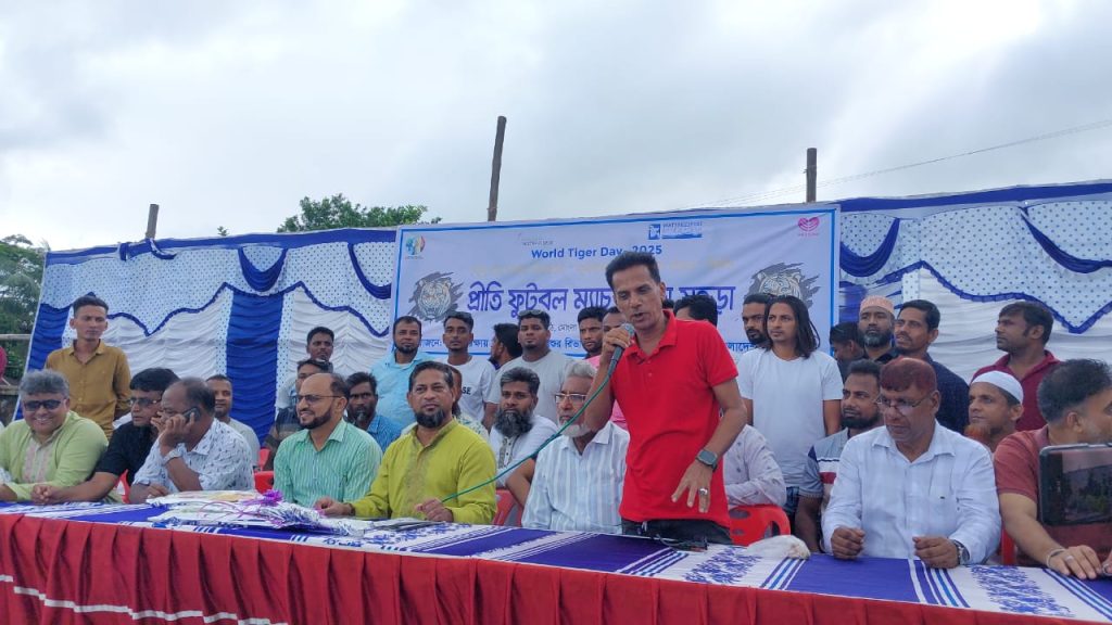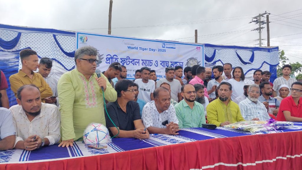 বাঘ ও সুন্দরবন রক্ষায় সচেতনতা সৃষ্টির লক্ষ্যে মোংলায় ৩০ জুলাই ২০২৫ বুধবার বিকেলে ৪ঃ৩০ মিনিটে মিঠাখালী বাজার মাঠে প্রীতি ফুটবল ম্যাচ ও বাঘ মহড়া অনুষ্ঠিত হয়। বিশ্ব বাঘ দিবস উপলক্ষে ধরিত্রী রক্ষায় আমরা (ধরা), পশুর রিভার ওয়াটারকিপার, ওয়াটারকিপার্স বাংলাদেশ এবং ওয়াইল্ড টিম এর আয়োজনে এই বাঘ মহড়া ও প্রীতি ফুটবল ম্যাচ অনুষ্ঠিত হয়। বাঘ মহড়া ও প্রীতি ফুটবল ম্যাচের উদ্বোধনী অনুষ্ঠানে সভাপতিত্ব করেন ধরিত্রী রক্ষায় আমরার (ধরা) কেন্দ্রীয় নেতা পশুর রিভার ওয়াটারকিপার পরিবেশযোদ্ধা মো. নূর আলম শেখ। অনুষ্ঠানে প্রধান অতিথির বক্তৃতা দেন বিএনপির কেন্দ্রীয় গবেষণা বিষয়ক সম্পাদক ও আরাফাত রহমান কোকো ক্রীড়া সংসদের কেন্দ্রীয় সাধারণ সম্পাদক কৃষিবিদ মোহাম্মদ শামীমুর রহমান শামীম। এ সময় অন্যদের মধ্যে উপস্থিত ছিলেন আব্দুল মান্নান হাওলাদার, বীর মুক্তিযোদ্ধা শেখ আবু হানিফ, ক্রীড়া ব্যক্তিত্ব শেখ রুস্তম আলী, এমরান হোসেন, এম সাইফুল ইসলাম, মো. শাহ আলম শেখ, রকিবুল ইসলাম, মেহেদী হাসান সবুজ, সোহেল হাওলাদার, নাজমুল হক, হাছিব সরদার, মেহেদী হাসান বাবু, প্রমুখ। উদ্বোধনী অনুষ্ঠানে প্রধান অতিথির বক্তৃতায় কৃষিবিদ মোহাম্মদ শামীমুর রহমান শামীম বলেন, বাঘ রক্ষায় সচেতনতা বাড়াতে হবে। সুন্দরবনে বাঘ চোরাচালানের আন্তর্জাতিক চক্রকে রুখতে হবে। সুন্দরবন সংলগ্ন এলাকার বাঘ মানুষের দ্বন্দ্ব নিরসন করে সবাইকে বাঘ বন্ধু হতে হবে। উদ্বোধন অনুষ্ঠানের বাঘ মহড়া পরিবেশন করেন ওয়াইল্ড টিম এর ভিটিআরটির সদস্যরা। এরপর প্রীতি ফুটবল ম্যাচে অংশ নেন মিঠাখালী ইউনিয়ন বনাম চাঁদপাই ইউনিয়ন। খেলা শুরুর আগে কৃষিবিদ মোহাম্মদ শামীমুর রহমান শামীম মিঠাখালী বাজার মসজিদ চত্বরে ধরা ও ওয়াটারকিপার্স বাংলাদেশের আয়োজনে মাসব্যাপী বৃক্ষরোপণ কর্মসূচির উদ্বোধন ঘোষণা করেন।