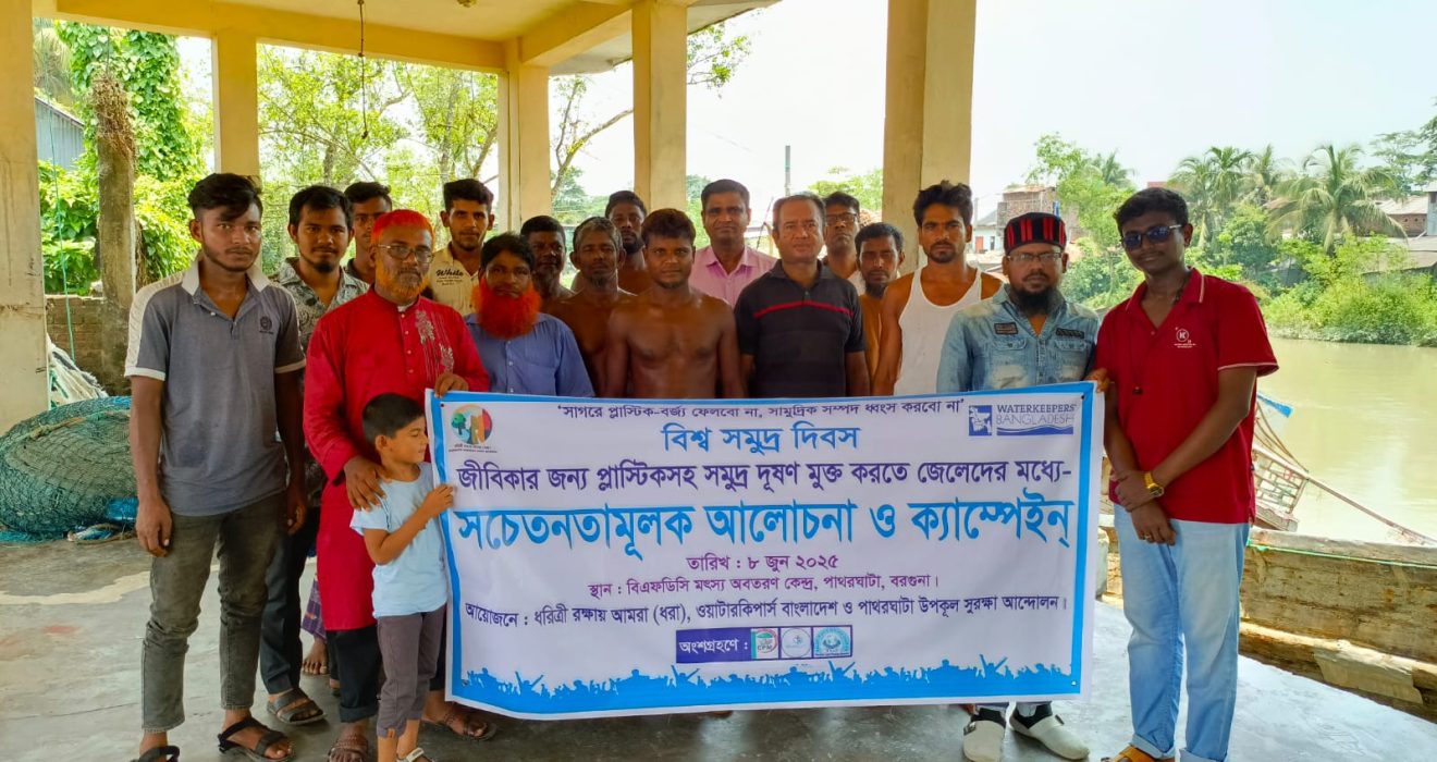 ‘সাগরে প্লাস্টিক ফেলবো না, সমুদ্র নষ্ট করবো না’ এ স্লোগান নিয়ে ৮ জুন রোববার বেলা ১১ টায় ধরিত্রী রক্ষায় আমরা (ধরা), ওয়াটারকিপার্স বাংলাদেশ ও পাথরঘাটা উপকূল সুরক্ষা আন্দোলনের যৌথ আয়োজনে বরগুনার পাথরঘাটায় ‘বিশ্ব সমুদ্র দিবস ২০২৫’ পালিত হয়েছে। দেশের বৃহত্তম মৎস্য অবতরণ কেন্দ্র (বিএফডিসি) তে বিশ্ব সমুদ্র দিবস উপলক্ষে সমুদ্রকে প্লাস্টিকসহ দুষনমুক্ত করতে সমুদ্রগামী জেলেদের মাঝে সচেতনতামূলক আলোচনা ও ক্যাম্পেইন অনুষ্ঠিত হয়। এ উদ্যেশে বক্তব্য রাখেন, সুপ্রিম কোর্টের আইনজীবী মনোজ কুমার কীর্তনীয়া, পাথরঘাটা উপজেলা যুবদলের সাবেক সভাপতি এরফান আহমেদ সোয়েন, উপকূল অনুসন্ধানী সাংবাদিক ও গবেষক শফিকুল ইসলাম খোকন, সাংবাদিক সোহেল মল্লিক, স্বেচ্ছাসেবক সোয়েব তাসিন, জেলে ছগির হোসেন, আব্দুল জলিল প্রমুখ।