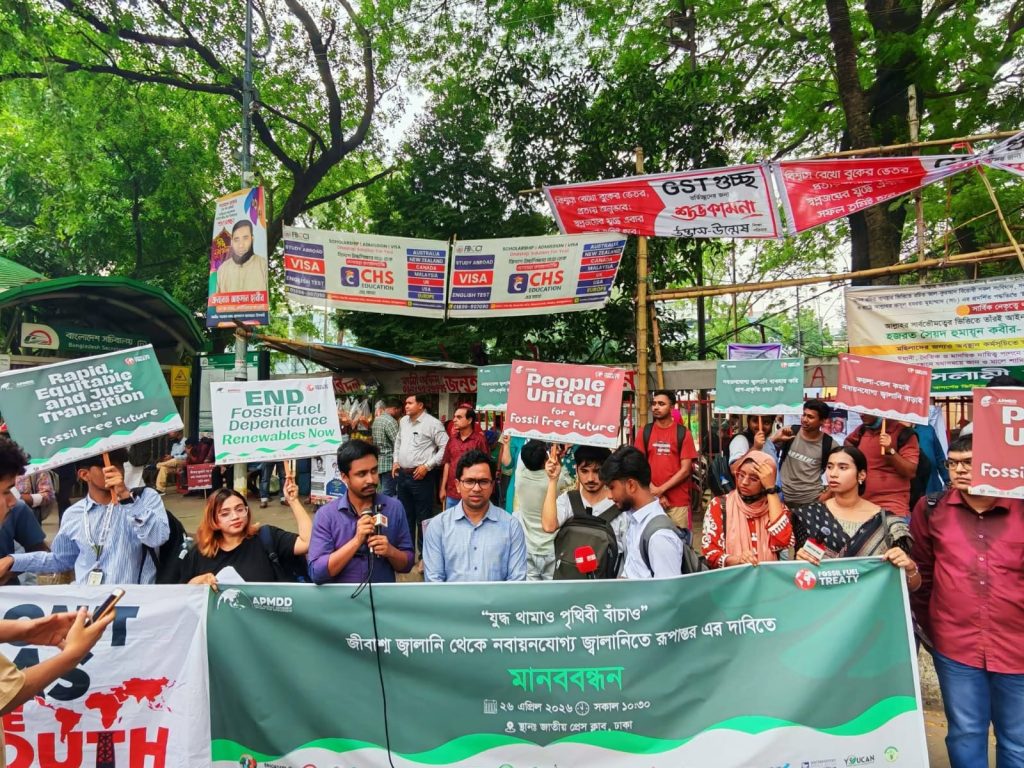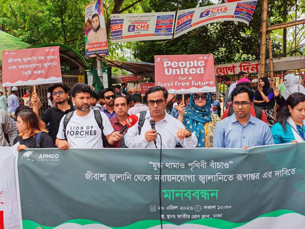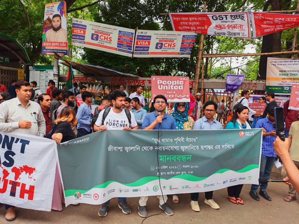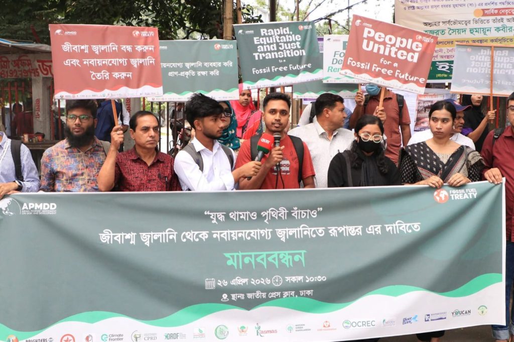 জীবাশ্ম জ্বালানির ওপর নির্ভরতা কমিয়ে নবায়নযোগ্য জ্বালানিভিত্তিক ন্যায্য ও টেকসই ভবিষ্যৎ গড়ার দাবিতে ধরিত্রী রক্ষায় আমরা (ধরা) এবং ওয়াটারকিপার্স বাংলাদেশের উদ্যোগে দেশব্যাপী কর্মসূচি পালিত হয়েছে। ২৮–২৯ এপ্রিল ২০২৬ কলম্বিয়ার সান্তা মার্তায় অনুষ্ঠিতব্য আন্তর্জাতিক সম্মেলনকে লক্ষ্য করে ঢাকা সহ দেশের ১০টি স্থানে মানববন্ধন, আলোচনা সভা ও সচেতনতামূলক কার্যক্রম অনুষ্ঠিত হয়। ঢাকায় জাতীয় প্রেস ক্লাবের সামনে “যুদ্ধ থামাও, পৃথিবী বাঁচাও” স্লোগানে মানববন্ধনে জ্বালানি রূপান্তর ও ন্যায্যতার দাবি ওঠে। একই দাবিতে পেকুয়া, পাথরঘাটা, কুতুবদিয়া, মোংলা ও কলাপাড়া এলাকায় মানববন্ধন ও অবস্থান কর্মসূচি অনুষ্ঠিত হয়, যেখানে স্থানীয় জনগণ ও পরিবেশকর্মীরা অংশ নেন। পাবনার চাটমোহরে নদী পুনরুদ্ধার ও জীবাশ্ম জ্বালানি থেকে রূপান্তরের পাশাপাশি পরিবেশ, জীবন ও জীবিকা রক্ষার দাবি জানানো হয়। তালতলী ও বরগুনায় কয়লাভিত্তিক বিদ্যুৎকেন্দ্র বন্ধসহ উপকূলীয় মানুষের জীবিকা ও পরিবেশ সুরক্ষার আহ্বান জানানো হয়। জামালপুরে মানববন্ধন ও আলোচনা সভায় নবায়নযোগ্য জ্বালানিতে দ্রুত রূপান্তরের ওপর গুরুত্ব দেওয়া হয়। মোংলায় বক্তারা যুদ্ধ, জ্বালানি সংকট ও মূল্যবৃদ্ধির প্রেক্ষাপটে জনগণকেন্দ্রিক জ্বালানি ব্যবস্থার প্রয়োজনীয়তা তুলে ধরেন। সব কর্মসূচিতে এককভাবে জোর দেওয়া হয়ঃ ন্যায্য, গণতান্ত্রিক ও নবায়নযোগ্য জ্বালানি রূপান্তরই টেকসই ভবিষ্যতের একমাত্র পথ।