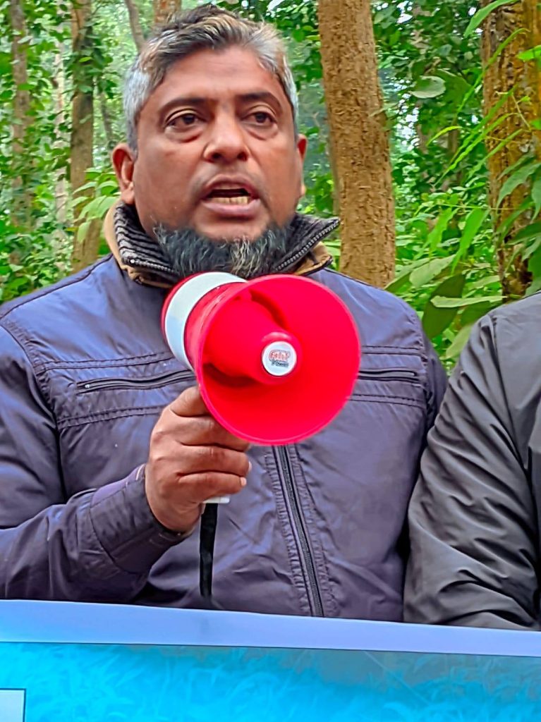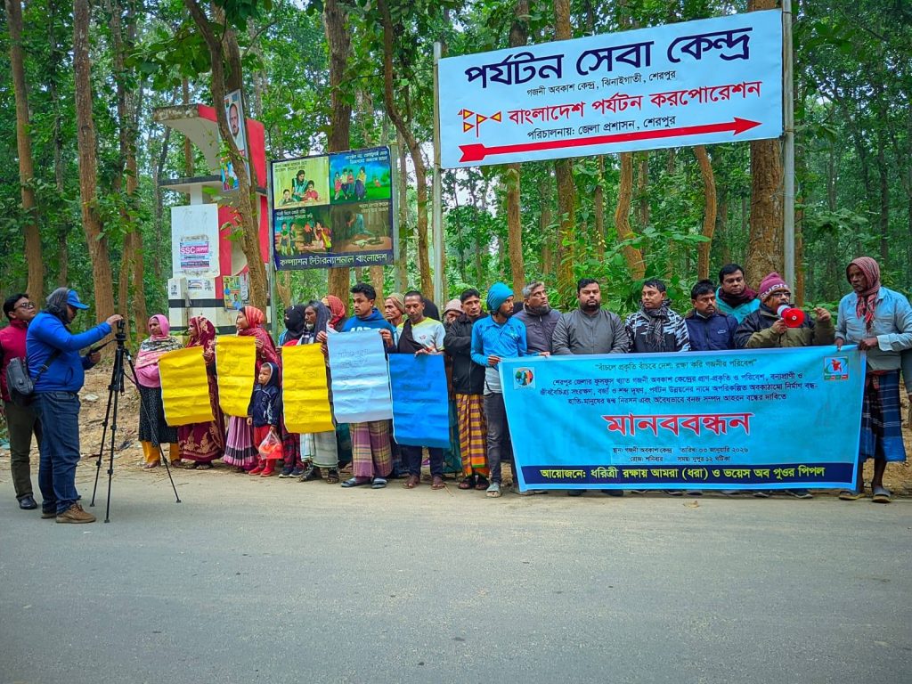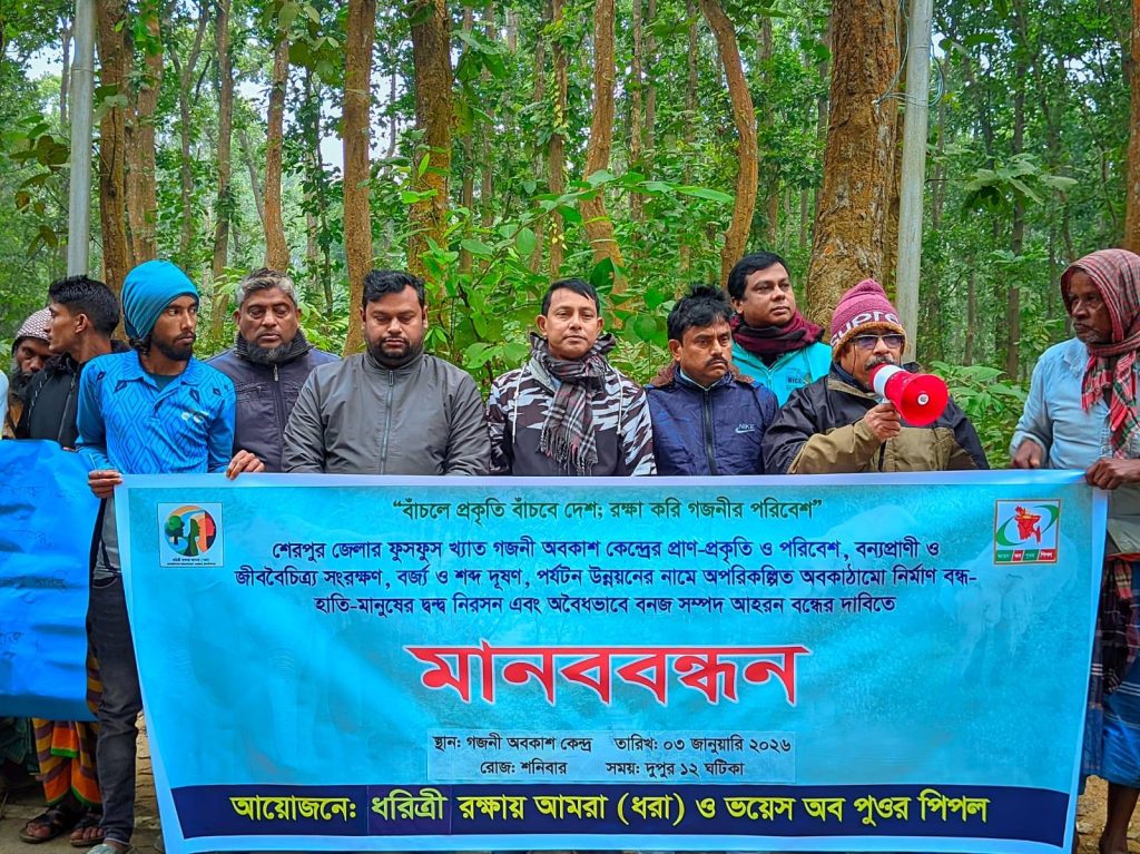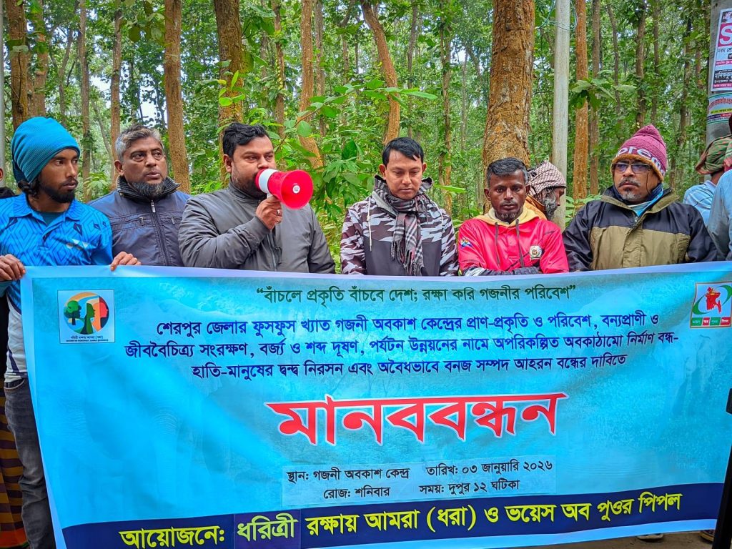 ০৩/০১/২০২৬ ইং তারিখে দুপুর ১২ ঘটিকার সময় ধরিত্রী রক্ষায় আমরা ( ধরা) ও ভয়েস অব পুওর পিপল এর আয়োজনে শেরপুর গজনী পাহাড়ের প্রান- প্রকৃতি ও পরিবেশ সংরক্ষণের জন্য অপরিকল্পিত অবকাঠামো নির্মাণ বন্ধ করে ইকো ট্যুরিজম বাস্তবায়নে পাহাড় কাটা, প্লাস্টিক ও অন্যান্য বর্জ্য অপসারণে সুষ্ঠু ব্যাবস্থাপনা গ্রহনসহ শব্দদূষন বন্ধে মাইক ও সাউন্ড সিস্টেম ব্যবহারে নিষেধাজ্ঞা আরোপের দাবিতে শেরপুরের গজনী অবকাশ কেন্দ্রের সামনে এক মানব বন্ধন কর্মসূচি অনুষ্ঠিত হয়।