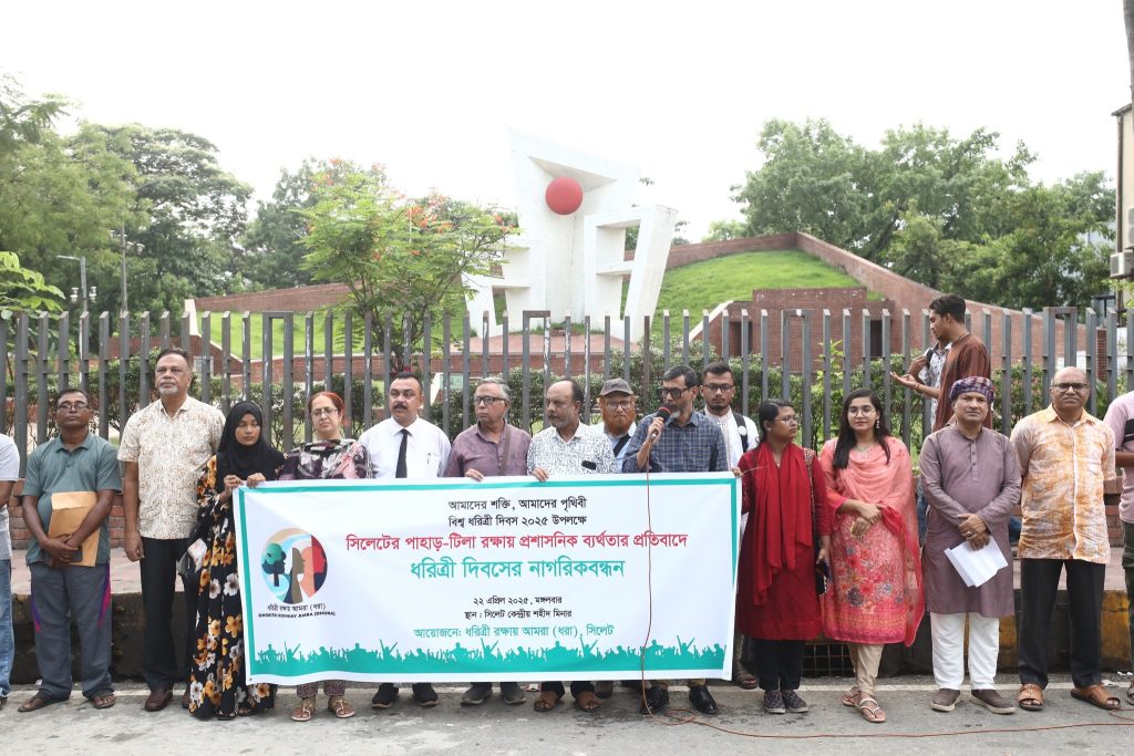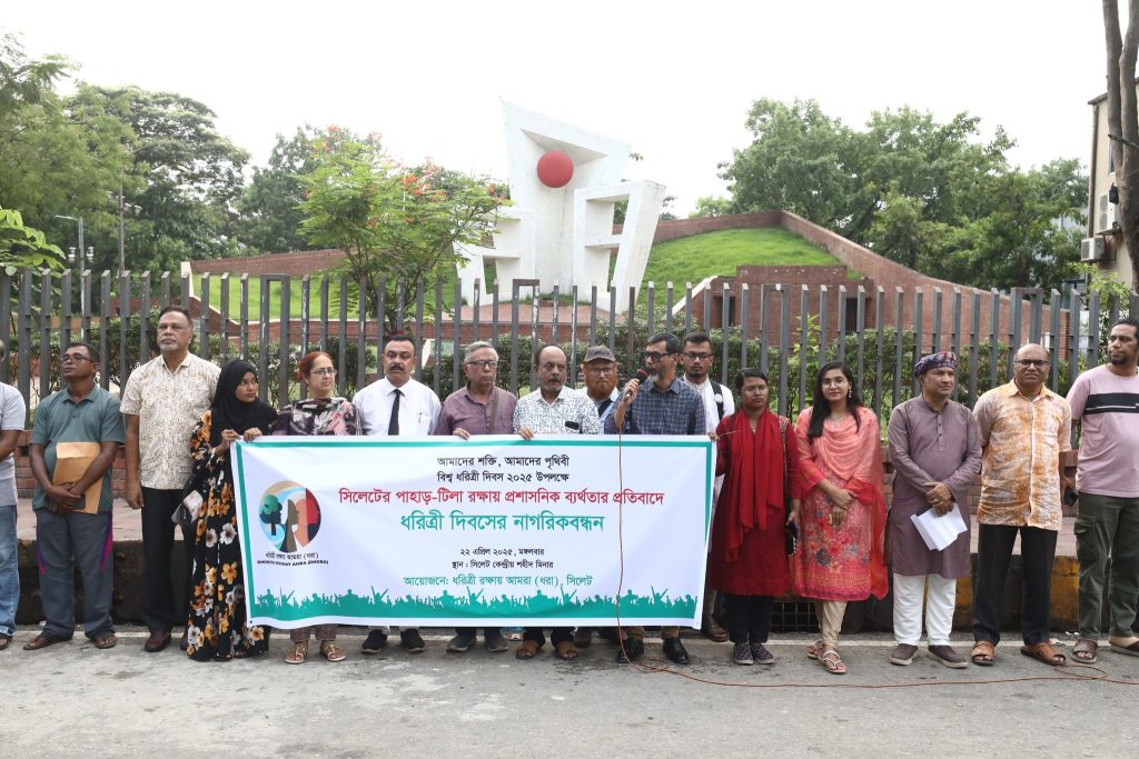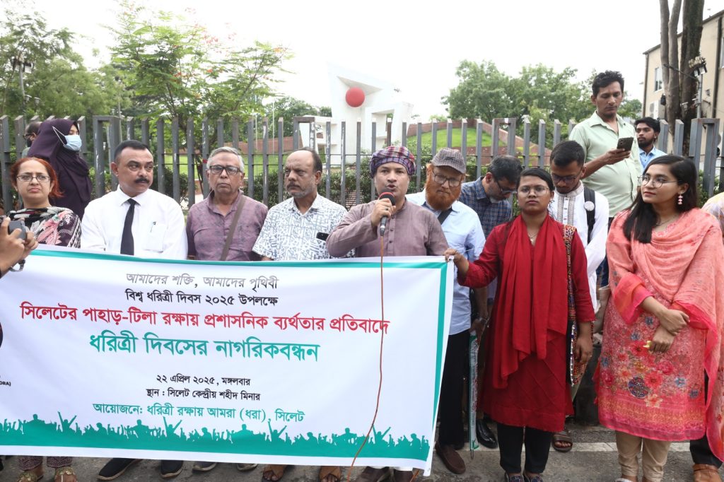সিলেট বিভাগজুড়ে চলছে পাহাড়-টিলা কেটে ভূমির শ্রেণি পরিবর্তনের হিড়িক। কখনো রাতের আঁধারে, কখনো দিনে প্রকাশ্যে পাহাড়-টিলার চিহ্ন নিশ্চিহ্ন করছে সংঘবদ্ধ ভূমিখেকোরা। কোথাও হাউজিং-এর নামে, কোথাও রিসোর্ট নির্মাণে প্রভাবশালীরা জড়িয়ে পড়ছেন। যা নিয়ন্ত্রণে সম্পূর্ণরূপে ব্যর্থ স্থানীয় প্রশাসন। এভাবে পাহাড়-টিলা কাটা চলতে থাকলে সিলেট বিভাগের ভূ-প্রকৃতি সম্পূর্ণভাবে বদলে যাবে। বন্ধ হয়ে যাবে প্রাকৃতিক ছড়ার প্রবাহ। শুষ্ক মৌসুমে দেখা দেবে পানির ভয়াবহ সংকট। বিশ্ব ধরিত্রী দিবস উপলক্ষে সিলেটের পাহাড়-টিলা রক্ষায় প্রশাসনিক ব্যর্থতার প্রতিবাদে পরিবেশবাদী সংগঠন ধরিত্রী রক্ষায় আমরা (ধরা) সিলেট শাখা আয়োজিত মানববন্ধন কর্মসুচিতে বক্তারা একথা বলেন। মঙ্গলবার বিকাল ৪টায় সিলেট কেন্দ্রীয় শহীদ মিনারের সম্মুখে ধরা সিলেট শাখার আহ্ববায়ক ডাঃ মোস্তফা শাহজামান চৌধুরী বাহার-এর সভাপতিত্বে মানববন্ধন কর্মসূচিতে মূল বক্তব্য রাখেন সিলেটের পরিবেশ আন্দোলনের সংগঠক ও ধরা’র সদস্য সচিব আব্দুল করিম কিম। কর্মসূচিতে ধরার পক্ষ থেকে লিখিত বক্তব্যে বলা হয়- সিলেট বিভাগের মধ্যে বর্তমানে পাহাড়-টিলা ধ্বংসে সবচেয়ে এগিয়ে আছে সিলেট জেলা। জৈন্তাপুরের পঞ্চাশের পাহাড়মালা, গোয়াইনঘাট, কোম্পানীগঞ্জ ও কানাইঘাটে পাহাড়-টিলা কর্তন হচ্ছে পাথর উত্তোলনে। যা এখন খনিজ সম্পদ আহরণ নামে অভিহিত হচ্ছে। হাজার কোটি কোটি টাকার পাথর আহরণের কারণে এই পাহাড়-টিলার বিনাশ থামছে না।